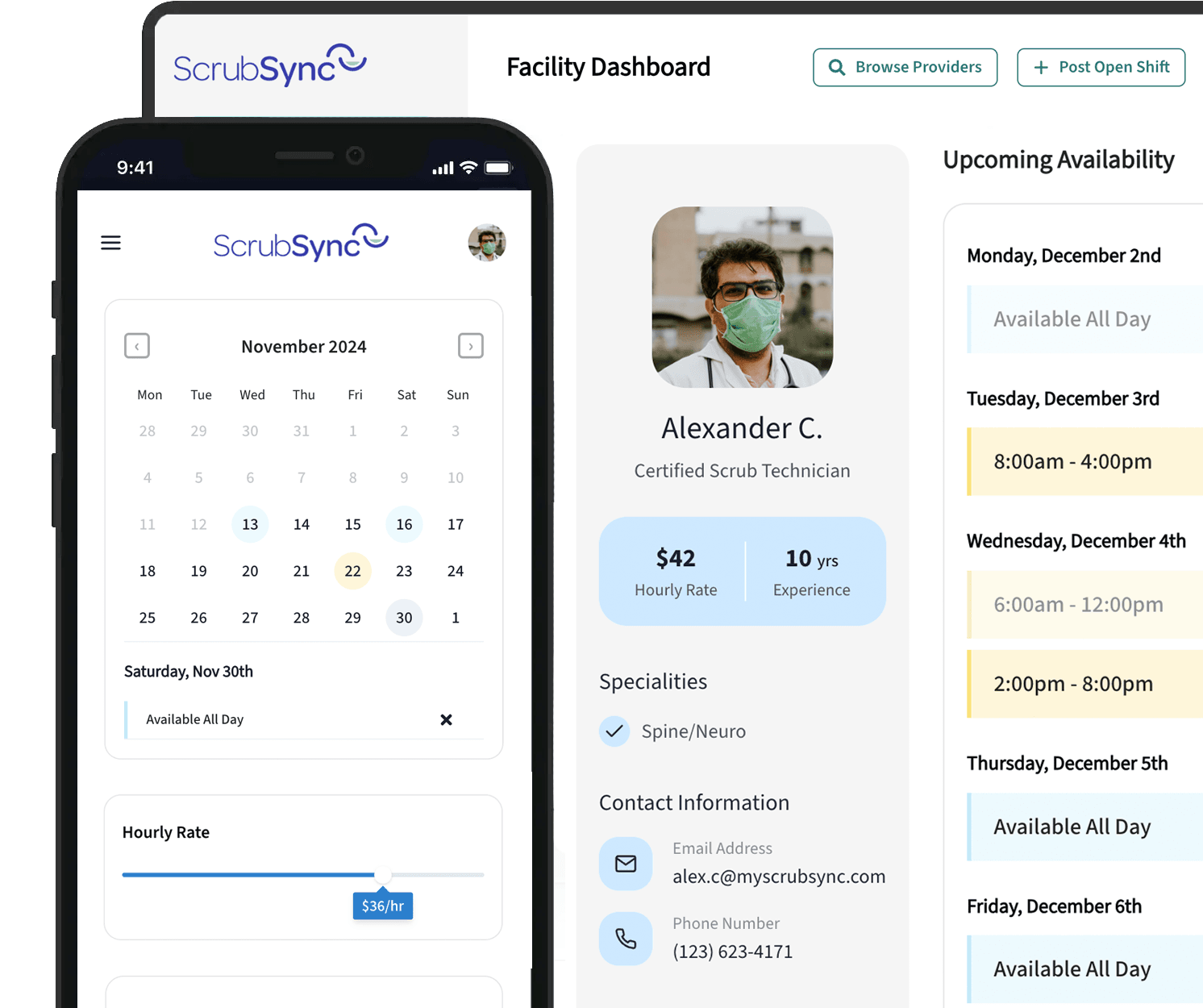 ScrubSync brings surgical facilities and professionals to one convenient place with a single goal: quality care through efficient scheduling.